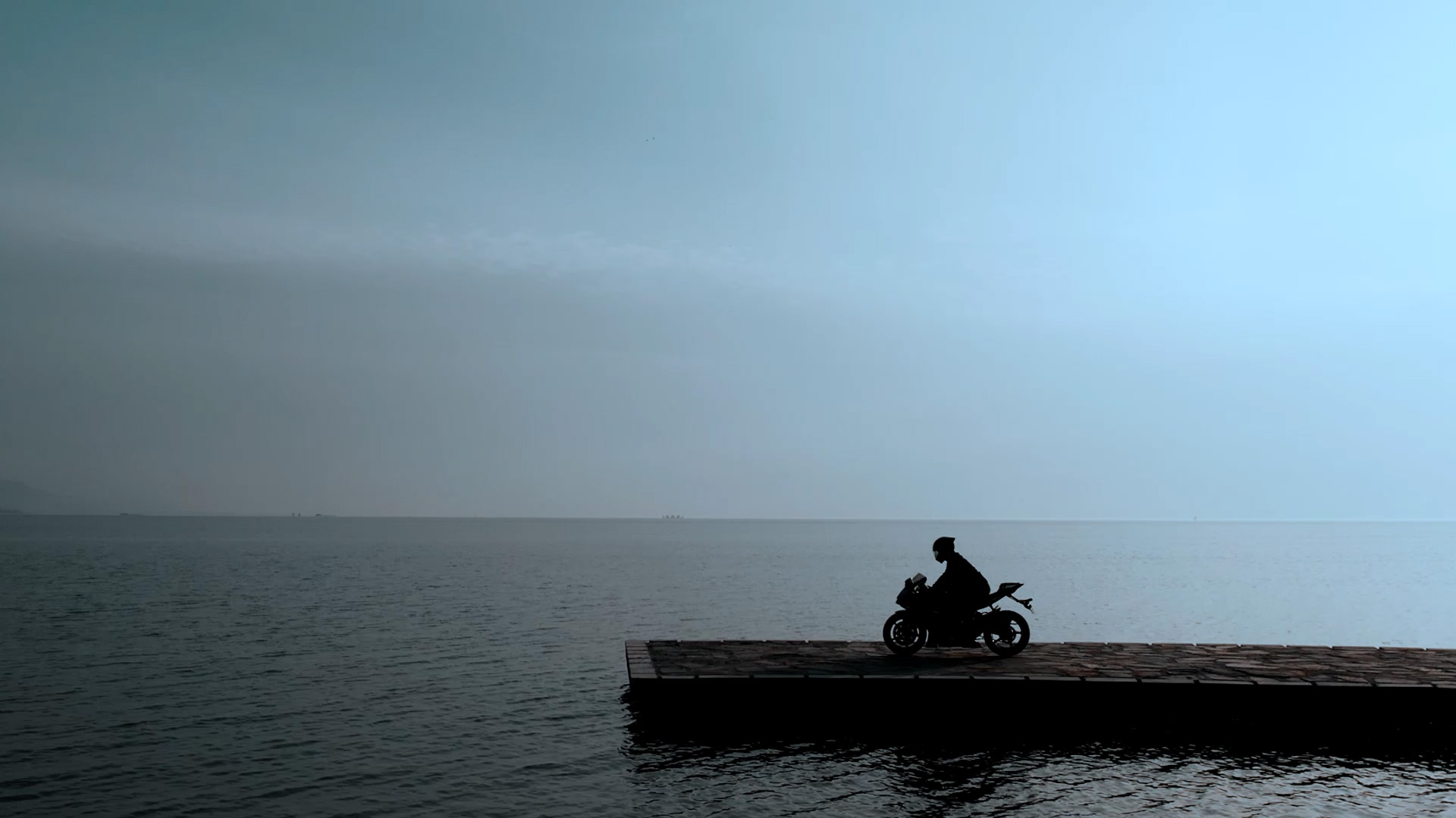骑手停在一处风景秀丽的湖畔,摘下头盔,深呼吸着清新的空气。他望向远方,脸上洋溢着满足和平静的笑容。此时,镜头采用慢动作,捕捉他轻轻触摸摩托车车身的动作,仿佛在与这位无言的伙伴进行心灵上的交流。